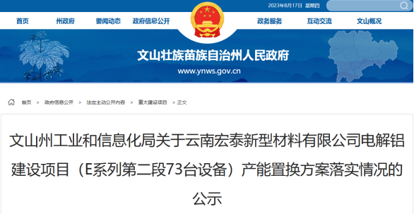 8月16日,文山州工业和信息化局发布《关于云南宏泰新型材料有限公司电解铝建设项目(E系列第二段73台设备)产能置换方案落实情况的公示》(以下简称“公示”),公示具体内容如下: