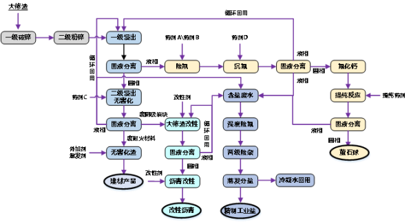 (4)废阴极资源化综合利用技术。本技术通过加入改性剂,帮助大修渣粉末更好地均匀分散在沥青中,以提升沥青的抗水损能力,保证氟化物沉淀不会与环境直接接触,在实现了废阴极炭块氟资源回收的同时,解决了废阴极炭块的终端建材资源化综合利用瓶颈问题。