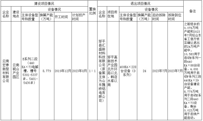 云南宏泰新型材料有限公司电解铝建设项目(E系列第二段73台设备)产能置换方案执行情况